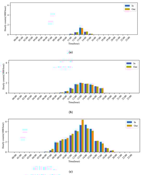 Hourly counts of incoming and outgoing actions. (a) 15 March 2023; (b) 7 April 2023; (c) 17 April 2023.