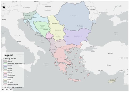 The area of the Balkan Peninsula (Figure 1) comprises a number of geographically significant natural areas, including the Adriatic Sea, the Ionian Sea, the Aegean Sea, and the west coast of the Black Sea, which have climatic similarities, as well as the continental area and the mountainous region, which have a considerable influence on the climate of the Balkan Peninsula. The northern and central parts of the Balkans are characterised by cold winters, warm summers, and well-distributed rainfall throughout the seasons. In contrast, the southern and coastal areas are characterised by a Mediterranean climate, with hot, dry summers and mild, relatively rainy winters [42,43,44,45].