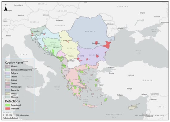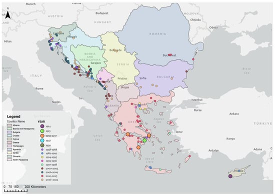 The fact that the pest has been detected near all the major commercial harbours in Koper (Slovenia), Rijeka, Split and Dubrovnik (Croatia), Bar (Montenegro), and Vlora (Albania), during the 75-year study period, undoubtedly indicates multiple introductions along the Adriatic coast, where it became established and subsequently spread further. The historical distribution of the medfly in the Balkan Peninsula is shown in Figure 3. The currently recorded Medfly population is shown in Figure 4. Appendix Table A2 provides a list of locations where the medfly has been detected, based on the order of historical detections, geographical coordinates, and the countries where it was found.