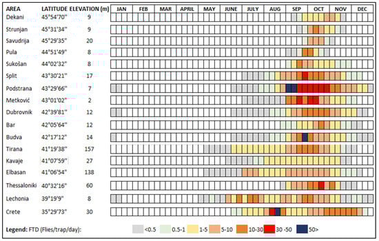 The data presented in Figure 5 show a significant influence of the latitude on the onset of adult medfly activity (adult captures) and on the duration of flight during the season. In the northern coastal region between 44° and 45°, adult catches in Slovenian and Croatian Istria and in central Macedonia (Greece) start in mid-September and end in mid-November [57,91]. In contrast, adult catches in the coastal region between 42° and 43° in the Dalmatian region of Croatia and Montenegro start in mid-June and last until the end of December and, in some years, rare individuals are caught in January/June of the following year [61,71,88,90,104,105]. The earliest start of the medfly flight is recorded in the area between 39° and 41° latitude in early or mid-May and lasts until the end of the year, as is also the case in Albania and western Greece [58,71,94].