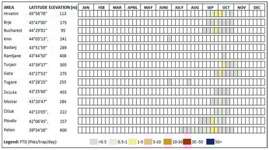 In areas where the medfly is established, the pest is usually inactive between January and April and, in recently invaded areas, this absence is prolonged until September, when adults are caught in traps. Even the medfly is unable to overwinter at the egg stage; there is evidence that it can survive low temperatures in fruit hosts as a larva and, to a much lesser extent, in the pupal and adult stages [109]. The onset of adult pest activity in established areas begins between May and August, depending on the location and conditions in the particular year. The peak of the medfly activity is observed in autumn, usually between September and November, and a strong decline is observed between November and December (Figure 5). In recently invaded areas, the flight period is significantly shorter and is at least one and a half months or less during September and October, which overlaps with the peak in the population in the established distribution areas (Figure 6). We, therefore, divided the year into three seasons (January–April, May–August, and September–December), which is important from a phenological perspective for the medfly and its ability to reproduce, while maintaining some common environmental characteristics of the seasons. The seasonal activity of the medfly in the Balkan Peninsula shows that the first four months of the year are much less suitable for medfly activity (Figure 5) [22,89]. During these months, medfly usually overwinter as larvae in host fruits or partly at the pupal stage in the soil, while adults rarely overwinter in urban hotspots [22,89,109]. In the period from May to August, the climatic suitability for the medfly is well-pronounced, while the highest density of medfly is observed in September and October.