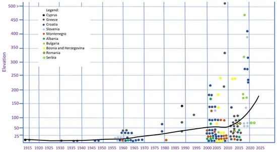 The first scenario is observed in Greece and the eastern part of the Adriatic (Croatia, Montenegro, and Albania). After the first detections (1915 and 1947–1960, respectively), the medfly spread southwards and northwards or along the coastal and island regions, where the conditions were suitable for its development. This trend continued for several decades in the case of Croatia and Greece (Figure 3), where the possibilities for inland spread are given in terms of host availability and climate. However, the medfly continued to spread and only established itself in areas at low altitudes (usually <50 m). Until the year 2000, only very rare detections at higher altitudes were reported. From 2000 onwards, the medfly began to penetrate previously less favourable geographical areas and establish itself at significantly higher altitudes (Figure 7). A similar trend in terms of further spread after initial detection can be observed in the case of Montenegro, where the pest has spread westwards, along the coast, in recent decades (Figure 3). In Albania, the medfly was also discovered on a large scale along the coastal areas, where numerous hosts were available (Figure 3). The occurrence in the Albanian mainland, around Tirana, Kruje, and Elbasan, can certainly not be interpreted as the spread of the medfly, but as an introduction and establishment in areas with altitudes < 200 m (Figure 7). It seems that the medfly follows the pathways and corridors with the least environmental resistance during its progressive invasion, as suggested in regard to California (USA) [113].