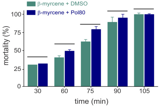 Toxicity of β-myrcene against Aedes aegypti larvae using dimethyl sulfoxide (DMSO) or polysorbate 80 (Pol80) as solubilizing agents. The β-myrcene concentration was of 238 mg/L. Each bar represents the mean (±standard error) of four replicates. Bars grouped by horizontal lines indicate the absence of significant statistical differences (Tukey’s Honest Significant Difference (HSD) test, p > 0.05).