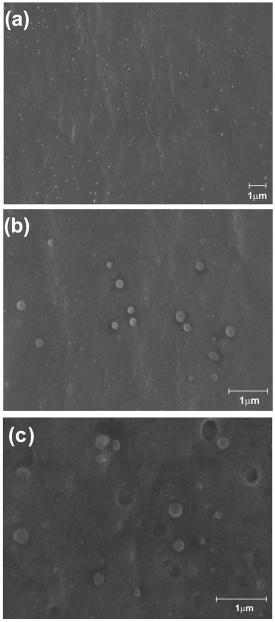 Scanning electron microscopy (SEM) of chitosan nanoparticle suspensions, containing β-myrcene, at a magnification of 4500× (a), 18,000× (b), and 22,000× (c). The nanocomposites exhibited a spherical structure with a smooth surface and showed a size variation ranging from 30–280 nm.