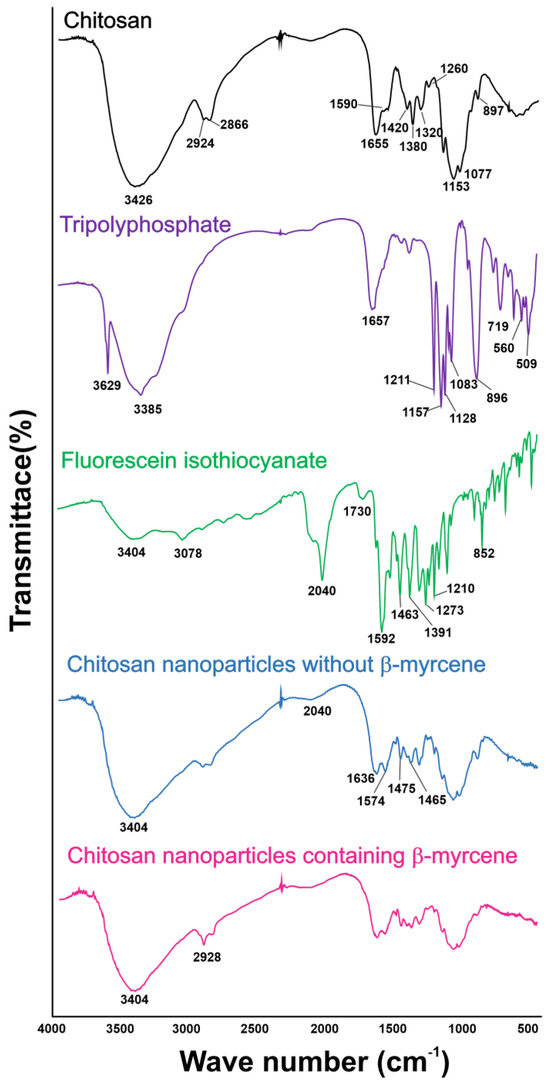 As described in Figure 3, the Fourier transform infrared (FTIR) analysis of chitosan revealed the band corresponding to νC=O of amide (amide I) and δN–H of amide (amide II) at 1655 per cm and 1590 per cm (Figure 3, black line). The spectrum for TPP is shown in Figure 3 (purple line). Bands at 3629 per cm and 3385 per cm are related to νO–H. At 1657 per cm is the band related to δO–H. The peaks at 1211, 1157, and 1128 per cm are attributed to the asymmetric νPO32− of the terminal groups. The peak at 1083 per cm is due to the symmetrical deformation of the terminal PO32− groups. The peaks at 896 and 719 per cm are characteristic of the asymmetrical and symmetrical axial deformation, respectively, of the main-chain P-O-P bond. The peaks at 560 and 509 per cm may be attributed to the δ PO32− of the terminal groups [53]. The FTIR analysis for FITC revealed low-intensity bands at 3404 per cm, referring to the νO–H bond and at 3078 per cm, referring to the νC–H bond of the aromatic ring (Figure 3, green line). In 2040 per cm, there is an intense band referring to the N=C=S group [54]. Chitosan nanoparticles without β-myrcene (Figure 3, blue line) and with β-myrcene (Figure 3, magenta line) showed the following bands: 1633, 1574, 1463, and 1475 per cm, which correspond to νC–H of amide (amide I), δN–H of amide (amide II), C=C from aromatic ring, and N-H from amine, respectively.