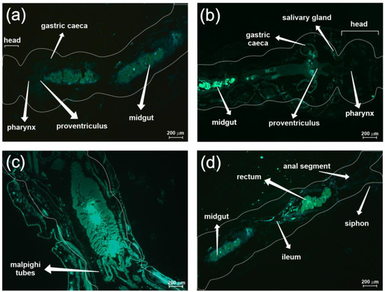 The images obtained with the fluorescence microscope revealed that CNPM and CNPP nanoparticles (i.e., containing and not containing β-myrcene) could be widely distributed in the alimentary tracts of the larvae (Figure 4). However, intense fluorescence was detected for the foregut, midgut, and hindgut sections.