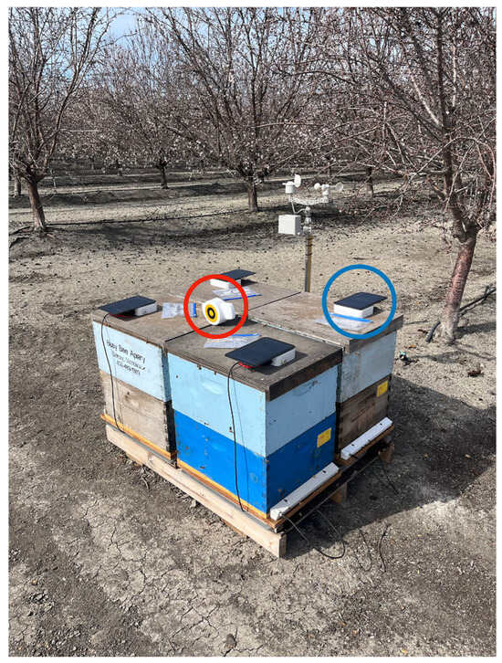 Weight data for each hive were collected using the custom-built electronic hive scales, (stainless steel doughnut design comprising four load cells, one in each corner of the scale; max load capacity: 160 kg, precision: ±100 g). The meteorological conditions were continuously monitored throughout the duration of the experiment using a purpose-built weather station, composed of a rain gauge, i.e., a tipping bucket sensor that measures rainfall, a spinning cups sensor that measures the wind speed and a wind vane sensor that determines the wind direction. A thermometer that measures ambient temperature was housed within the rain gauge enclosure. All the weather sensors were mounted to a stand, which was placed at one of the central pallets of hives as seen in Figure 2. Power was supplied to the equipment fitted to each hive using a 5 W solar panel and a lithium-ion power bank, housed in a waterproof enclosure, as seen on top of the hives (circled blue in Figure 2). All data measurements from the weather station, the weight registered by the hive scales and the cumulative bee activity measured by the bee counter were recorded synchronously at 10 min intervals and uploaded to the central server every 30 min, using a communication gateway connecting to the cellular network (circled red in Figure 2).