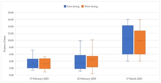 All hives were subject to a colony strength assessment on three occasions during the experiment; (17 February 2023, 22 February and 17 March 2023). The first two inspections were completed using the Liebefeld method [25] to assess the frames occupied by the adult bees, eggs, open and closed brood, nectar and pollen stores, whereas the third was a generic beekeeper estimation of the frames occupied by the adult bees and nectar stores. Data on colony strength, expressed as frames of adult bees (FOB), were analysed with respect to the treatment group (east- and west-facing entrances). The daily flight commencement and cessation times were determined as a timestamp at which the number of bees exiting the hive was ≥10 bees and <10 bees per minute (BPM), respectively. Subsequently, the bee flight hours were calculated as a sum of the times within range of the aforementioned BPM threshold parameters. Within each treatment group, the colonies were divided into two subgroups, weak and strong, based on the FOB parameter. The weak colony group consisted of six colonies with strengths of ≤3.25 FOB, whereas the strong colony group comprised six colonies of >3.25 FOB.