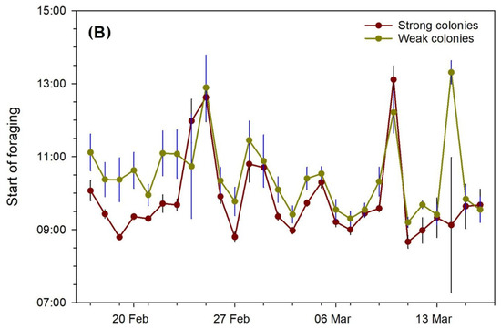 Figure 4. The average flight start time of the colonies during almond pollination for (A) east- vs. west-facing colonies and (B) strong vs. weak colonies. Error bars represent the standard error of the mean.