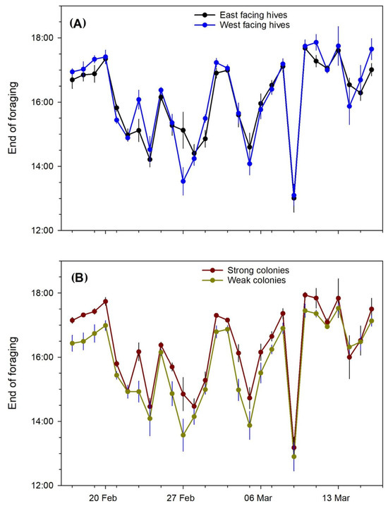 Figure 5. The average flight end time of the colonies during almond pollination for (A) east- vs. west-facing colonies and (B) strong vs. weak colonies. Error bars represent the standard error of the mean.