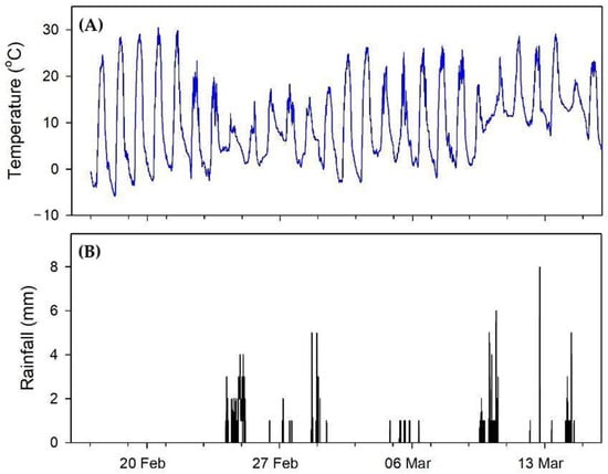 Figure 6. The weather conditions during the course of the study: (A) ambient temperature and (B) rainfall.