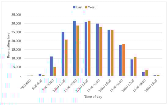 Dividing the cumulative daily trip figure of each group by the number of hours during which the bees egressed from the colonies yielded a measure of the flight density. The number of foraging trips per hour for the east-facing group is 30,859/h and 34,587/h for the west-facing group. Whereas flight density is marginally higher in the west-facing group, the results were not statistically significant (p = 0.31).