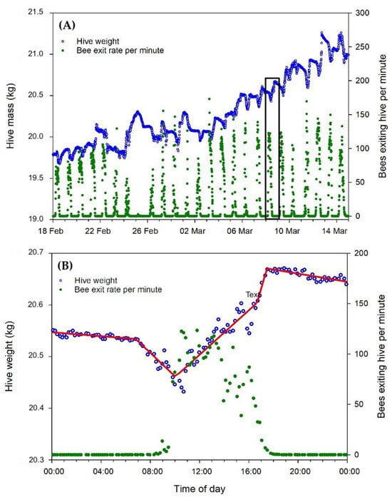 Figure 8. The hive mass and bee count data. (A) The sample data for a single colony throughout the experiment; (B) the 24 h dataset indicated in the black box outline in (A). The red line indicates the piecewise regression fit to the weight data.