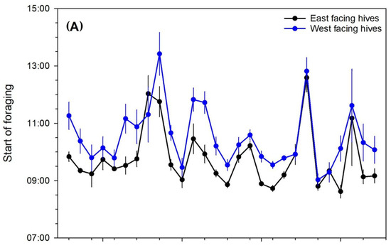 The average flight start time of the colonies during almond pollination for (A) east- vs. west-facing colonies and (B) strong vs. weak colonies. Error bars represent the standard error of the mean.