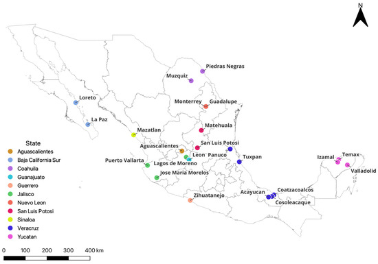Sampling sites of larval populations of Aedes aegypti in Mexico. Different colors indicate the state. In some states, more than one site was sampled.