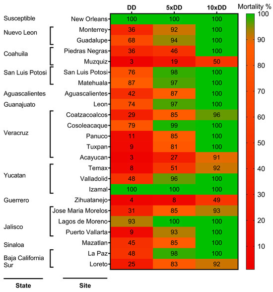 Additionally, the mortality percentages were compared between each population and for each discriminating concentration (1× DC, 5× DC, and 10× DC), and the populations that showed both significantly higher frequency and intensity of resistance were Zihuatanejo, from Guerrero, on the Pacific Coast; Muzquiz from Coahuila, in the northeast; and Acayucan from Veracruz, on the east coast (p < 0.05) (Figure 2).