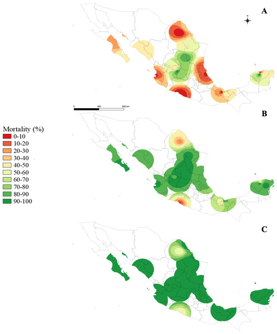 For 5× DC, the power value of two resulted in the lowest RMSE value (0.4724). These results show that in central Mexico, mortalities were estimated to be 90 to 100%. However, the same resistance pattern was displayed for most of the Pacific and Gulf of Mexico coasts (Figure 3B). Finally, mortality with 10× DC of temephos is almost fully recovered in all predicted areas, as shown by the power value of 2.5, with the lowest RMSE value (0.6779). Nonetheless, two areas remained with high intensity of temephos resistance, corresponding to the vicinity of the states of Coahuila and Guerrero (Figure 3C).