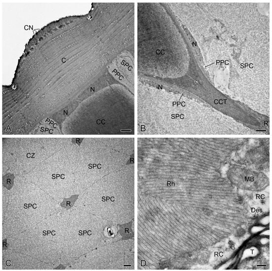 Cellular organizations of the Mythimna separata ommatidia, TEM. (A) Cornea and crystalline cone. (B) Proximal level of the crystalline cone, showing a crystalline cone tract. (C) Pigment-free clear zone is composed of secondary pigment cells and separates the ommatidial retinulae from each other. (D) Each retinula cell contributes microvilli to a fused rhabdom. C, cornea; CC, crystalline cone; CN, corneal nipple; CZ, clear zone; CCT, crystalline cone tract; Des, desmosome; MB, multivesicular body; N, nucleus; PPC, primary pigment cell; R, retinula; RC, retinula cell; Rh, rhabdom; SPC, secondary pigment cell; T, tracheole. Scale bars: (A–C) = 2 µm; (D) = 200 nm.