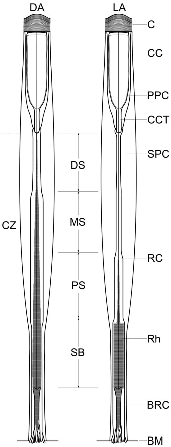 Diagram of dark-adapted (DA) and light-adapted (LA) ommatidia of M. separata, showing different adaptational changes in the retina in four different sections: the distal section of the clear zone (DS), the middle section of the clear zone (MS), the proximal section of the clear zone (PS), and the section beneath the clear zone (SB). BM, basal lamina; BRC, basal retinula cell; C, cornea; CC, crystalline cone; CZ, clear zone; CCT, crystalline cone tract; PPC, primary pigment cell; RC, retinula cell; Rh, rhabdom; SPC, secondary pigment cell.