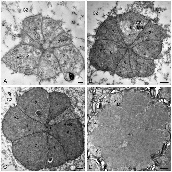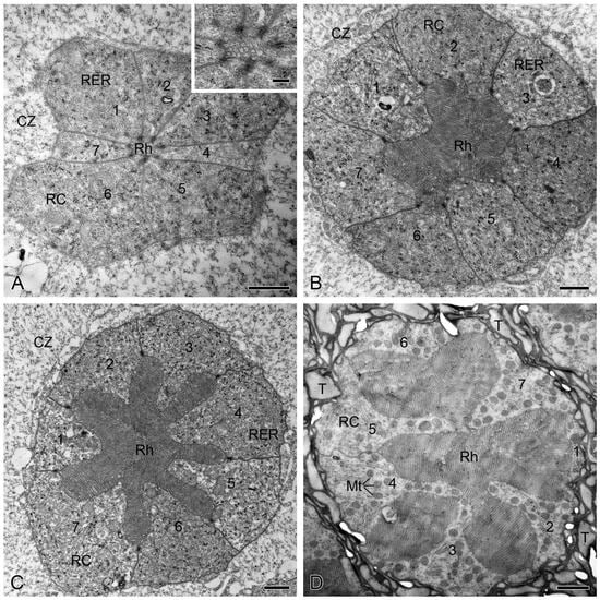 In the light-adapted eyes, the retinula traversing the clear zone is composed of seven regular retinula cells, which contain numerous vacuoles and multivesicular bodies in their cytoplasm within the clear zone, except for the proximal section (Figure 4A–C). Beneath the clear zone, these retinula cells contain some mitochondria (Figure 4D), which seem to bear relatively fewer than those present in the same section under the dark-adapted state, but we were unable to quantitatively confirm this in the current study. Within the clear zone, there are no significant differences in the cross-sectional area of retinulae between the distal section of 7.76 ± 0.67 μm2 (n = 8) and the middle section of 11.98 ± 1.00 μm2 (n = 16). Proximally, the cross-sectional area of retinulae significantly increases to 32.32 ± 1.05 μm2 (n = 17) in the proximal section of the clear zone and reaches a maximum of 76.76 ± 3.38 μm2 (n = 18) in the section beneath the clear zone (Figure 5A).