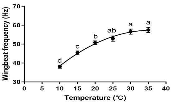 Effect of temperature on the WBF of P. xylostella. One-way ANOVA, F (5, 226) = 41.57, p < 0.001, different letters above the error bars indicate statistically significant differences in WBF (p < 0.05, with Tukey’s multiple comparisons test). n (10 °C, 15 °C, 20 °C, 25 °C) = 40, n (30 °C) = 38, n (35 °C) = 34. The data were collected from a mix of both male and female moths.