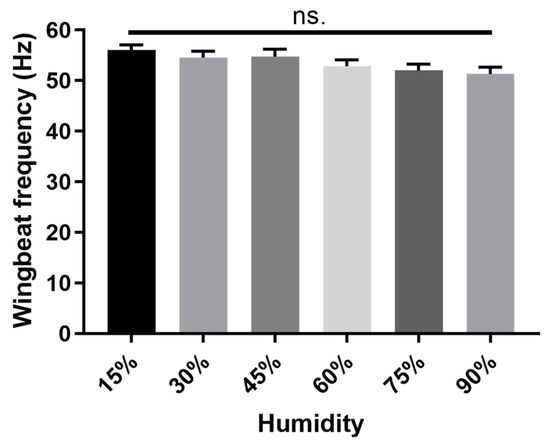 When exposed to varying relative humidity, the WBF showed an overall downward yet non-significant trend, with increasing humidity. The highest WBF was 56.05 Hz at 15% RH, and the lowest WBF was 51.32 Hz at 90% RH (Figure 2).