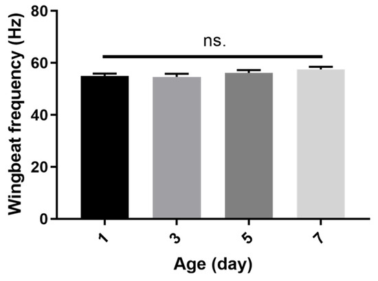 WBF for different ages of P. xylostella. One-way ANOVA, F (3, 236) = 1.552, p = 0.2019, no significant differences (‘ns’) were recorded across age groups (p > 0.05, with Tukey’s multiple comparisons test). n = 60 in each group. The data were collected from a mix of both male and female moths.