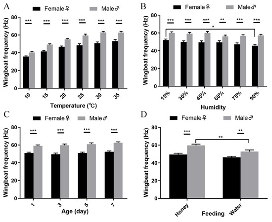 Sex-specific differences in P. xylostella WBF under various experimental regimes. Patterns are plotted for male and female WBF under different temperatures (A), humidities (B), different age groups (C), and under various feeding regimes (D). ‘**’ indicates a significant difference at p < 0.01, while “***” indicates a difference at p < 0.001 in the comparison between the male and female, by an unpaired t-test. ‘*’ in (B,D) indicates a significant difference at p < 0.05, by one-way ANOVA, F (5, 114) = 2.081, p = 0.0728, p < 0.05 with Tukey’s multiple comparisons test in (B); F (3, 120) = 15.20, p < 0.0001, p < 0.05 with Tukey’s multiple comparisons test in (D). n = approx. 20 each group in (A) and (B), n = approx. 30 for each group in (C,D). The black and grey bars present the data, which were collected from the female and male, respectively.