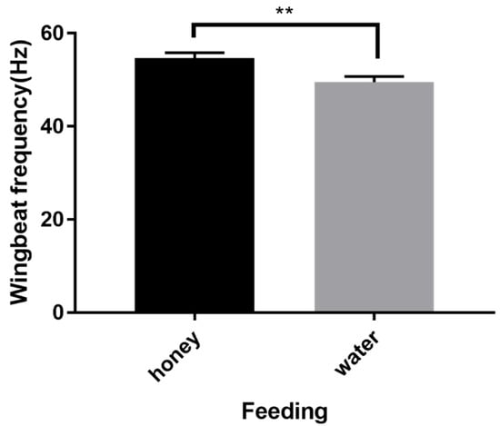 Effect of feeding regime on the WBF of P. xylostella. ‘**’ indicates a significant difference in wingbeat frequencies of P. xylostella (unpaired t test, p < 0.01). n = 60 for each group. The data were collected from a mix of both male and female moths.