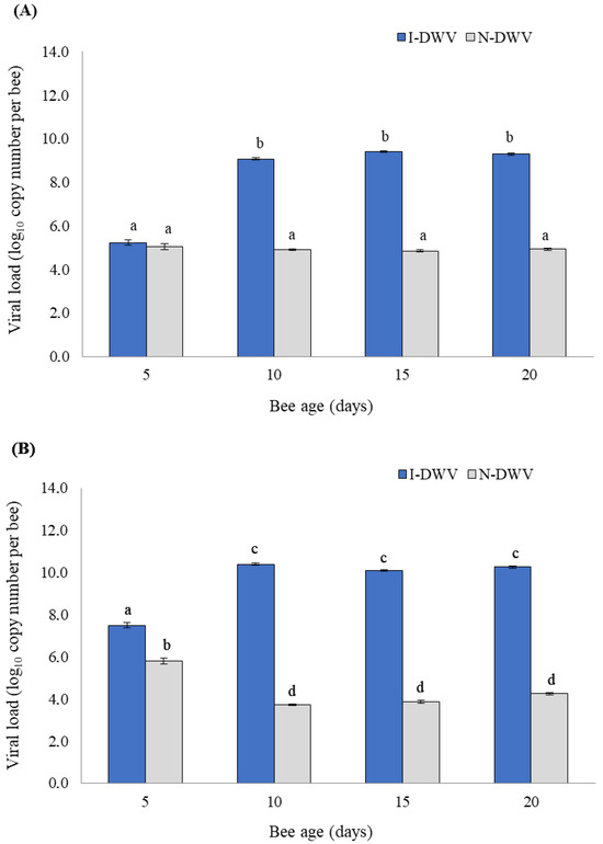 DWV-A load measured in the antennae (A) and head (B) of Apis mellifera of different ages that were inoculated (I-DWV) and non-inoculated (N-DWV). Means (±SE) with different letters indicate significant differences according to the Bonferroni test (p < 0.05) (n = 216).