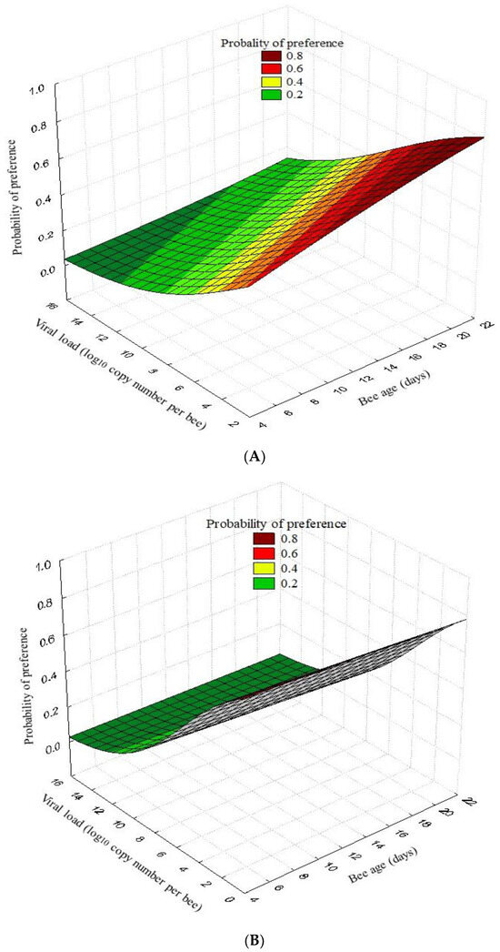Three-dimensional logistic regression curve representing the probability of the preference of honeybees for a pheromone compound (benzyl alcohol) vs. air (A) and a pheromone vs. an essential oil (B) in the function of the DWV-A load and bee age in the Y-tube test. When the bees were exposed to the pheromone compound vs. air, the bees that responded by preferring the pheromone were marked as positive (yes = 1, n = 76), while those that showed no preference were considered negative responses (no = 0, n = 140). When bees were exposed to the pheromone vs. the essential oil, the preference for the pheromone was considered positive (yes = 1, n = 63), while bees that showed no preference or preferred another compound were recorded as negative (no = 0, n = 153).
