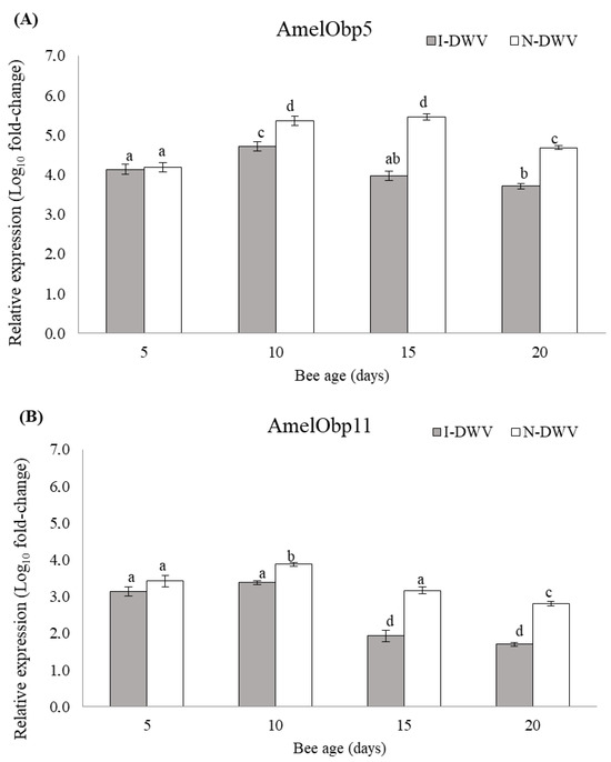 Gene expression of genes coding for OBPs in adult Apis mellifera antennae of different ages that were inoculated (I-DWV) and non-inoculated (N-DWV) with DWV-A. Means (±SE) with different letters indicate significant differences according to the Bonferroni test (p < 0.05) in (A) AmelObp5, (OBP5) and (B) AmelObp11 (OBP11) genes with relative expression (n = 216).