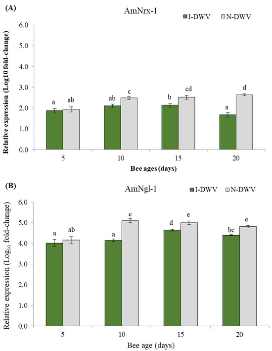 Gene expression of genes coding for neural proteins in adult Apis mellifera heads that were inoculated (I-DWV) and non-inoculated (N-DWV) with the DWV-A for different ages. Means (±SE) with different letters indicate significant differences according to the Bonferroni test (p < 0.05) in (A) AmNrx-1 (Neurexin) and (B) AmNgl-1 (Neuroligin) genes with relative expressions (n = 216).