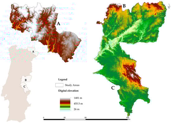 To assess the beekeeping potential, three Portuguese controlled areas, where there is a systematic control of bee diseases and high diversity of bee flora, were selected (Figure 1). These controlled areas comply with the EU regulations, Directive 92/65/EEC [], and with the recommendations from the World Organization for Animal Health, which define animal health policies and regulate the trade and importation of derived products. In turn, the high biodiversity of these areas, especially of melliferous plant species, can be explained by the fact that they are integrated into protected areas, thus receiving special protection due to their recognized natural, ecological, and cultural values. In total, the study areas cover 860,000 ha and are managed by three beekeepers associations.