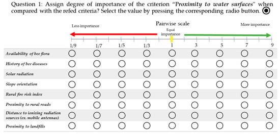 In addition to the selection of specific criteria, beekeepers played a key role in weighing their relative importance for beekeeping suitability mapping. To that end, an online survey directed to beekeepers was carried out. The survey consisted of two parts: (i) in the first one, a personal characterization was requested, and a brief introductory note on the evaluation and weighting criteria according to the AHP pairwise scale (Figure 2) was presented; (ii) the second part was composed of nine closed questions that allowed for a comparison between criteria. Throughout the questionnaire, the AHP pairwise comparisons were made by asking the experts: “Which of the two factors contributes more to beekeeping suitability?”. The response options were taken according to a nine-point numerical scale developed by Saaty (2008) [], which defines the importance of each criterion on a numerical scale from 1 to 9, where values below 1 mean less importance than the target criterion, 1 is defined as of equal importance, and higher values indicate that the analyzed criterion is more important than the target one (Figure 2). An example of the type of question is shown in Figure 2.