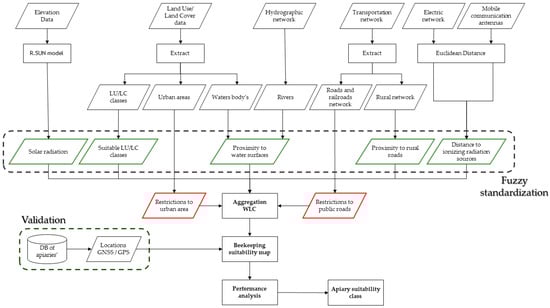 To assess beekeeping suitability, Geographic Information Systems (GIS) are a useful geospatial technology to overlap, relate, process, and analyze a variety of spatial data layers, aiming to achieve mapping by suitability classes. GIS data models considering environmental and socioeconomic aspects (e.g., weather conditions, orography, land use/land cover, and distances from settlements, roads, and water) for beekeeping planning have been designed in several research studies [,,,,,]. In line with the GIS, a set of decision making support techniques, based on multi-criteria decision analysis (MCDA), has been developed and applied to find the best solutions within multiple alternatives.