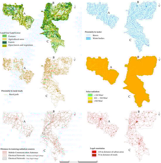 Spatial representation of the criteria used to assess the beekeeping potential in the controlled study areas: (A) Beekeepers Association of the Natural Park of Montesinho (AAPNM); (B) Beekeepers Association of the International Tejo Natural Park (Meltagus); (C) Beekeepers Association in northeast of Alentejo (Apilegre).