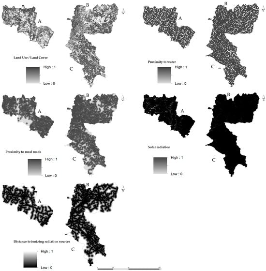 Since the integration and comparison of criteria are conditioned by the fact that they have different scales of measurement, it is necessary to normalize them on a common scale. Since the criteria are qualitatively and quantitatively measurable, it is necessary to carry out fuzzy standardization and transform the criteria into a continuous numerical scale, where the values vary between 0 and 1. The fuzzy approach proposed by Boroushaki and Malczewski [] was applied to convert the spatial data/criteria to be included in the analysis, as shown in Figure 5.