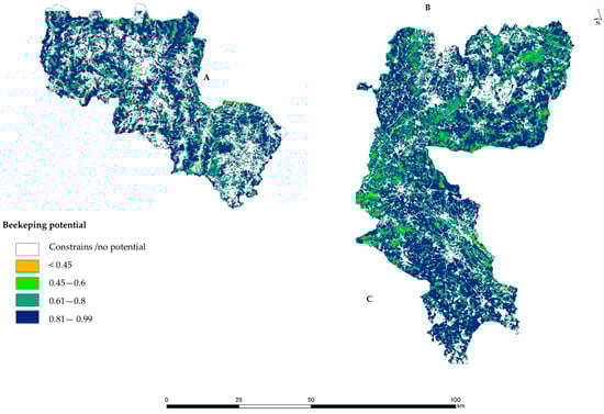Notwithstanding the achievements reported here on beekeeping potential mapping, there are still methodological aspects to be refined. The next steps involve (i) a more detailed characterization of the existing floral diversity; (ii) the restructuring of the questionnaire based on a wider participation of beekeeping stakeholders; (iii) the testing of other criteria that may influence beekeeping activity; (iv) improving the spatial resolution of these criteria; (v) replicating the adopted multi-criteria decision analysis approach in other beekeeping territories; and (vi) collecting information about the current honey production associated with the sites where the beekeeping potential was determined.