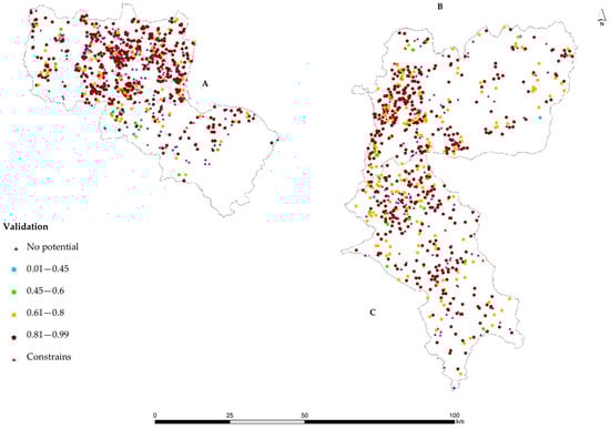 Spatial representation of the fuzzy standardization: (A) Beekeepers Association of the Natural Park of Montesinho (AAPNM); (B) Beekeepers Association of the International Tejo Natural Park (Meltagus); (C) Beekeepers Association in northeast of Alentejo (Apilegre).