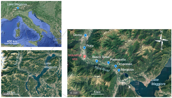 Six sampling sites were selected (Figure 1): two stations located upstream from the industrial site, namely Domo and Prata (8.6 km and 3.4 km from the industrial site, respectively); and four downstream stations, namely Bosco Tenso, Premosello, Ornavasso, and Mergozzo (3.7, 8.7, 13.1, and 14.4 km from the industrial site, respectively).