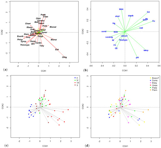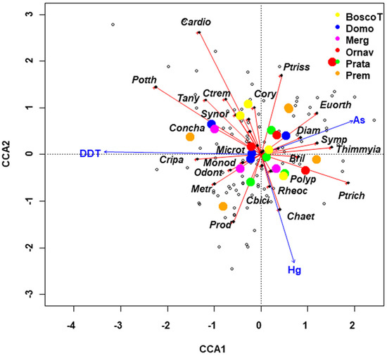 Partial CCA allowed to separate the upstream sites Domo and Prata, which clustered near the center of the plot, from the contaminated stations, namely Premosello, Bosco Tenso, Ornavasso, and Mergozzo, which were positioned at some distance from the center. DDT and As exerted opposite influences on the first axis, while Hg was correlated with the second axis (Figure 3, Table S7).