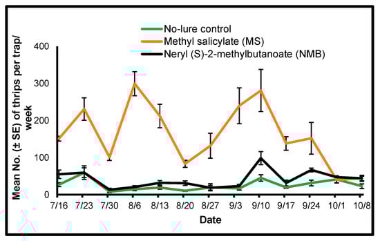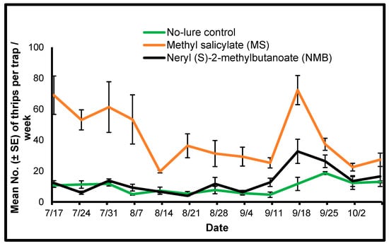 Mean (±SE) number of Frankliniella tritici per Delta trap per week counted from yellow sticky cards collected from traps placed in sweet pepper plots using two semiochemical lures (1: herbivore-induced plant volatile [HIPV] MS [methyl salicylate]; 2: thrips aggregation-pheromone NMB [neryl (S)-2-methylbutanoate]) and a no-lure control during 2019 in Nashville, Tennessee.