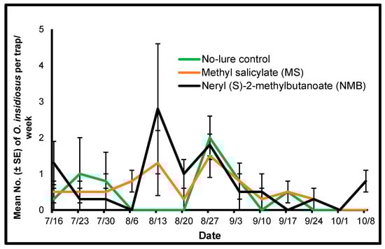 There was a significant interaction between treatment and the date of weekly trap collection in attracting O. insidiosus to each treatment (F = 8.01, df = 24, 107, p ≤ 0.0001). These interactions may be due to the population fluctuations of this species that occurred throughout the study period. We analyzed the data for each date as simple means using a one-way ANOVA (Proc Mixed) and compared the treatment means using LSMEANS. There was a significant treatment effect for the mean number of O. insidiosus attracted to the treatments on 6 August and 8 October 2018 (F = 9.0, df = 2, 6, p = 0.01 and F = 9.0, df = 2, 6, p = 0.01, respectively). There were significantly higher mean numbers of this species caught in the methyl salicylate treatment compared with the mean number caught in the no-lure control (t = −3.67, df = 6, p = 0.01) or the neryl (S)-2-methylbutanoate treatment (t = 3.67, df = 6, p = 0.01) (LSMEANS) on 6 August. There were significantly higher mean numbers of O. insidiosus caught in the neryl (S)-2-methylbutanoate treatment when compared with the mean number caught in the no-lure control (t = −3.67, df = 6, p = 0.01) or the methyl salicylate treatment (t = −3.67, df = 6, p = 0.01) (LSMEANS) on 8 October. Orius insidiosus was not abundant in high numbers throughout the study (Figure 2).