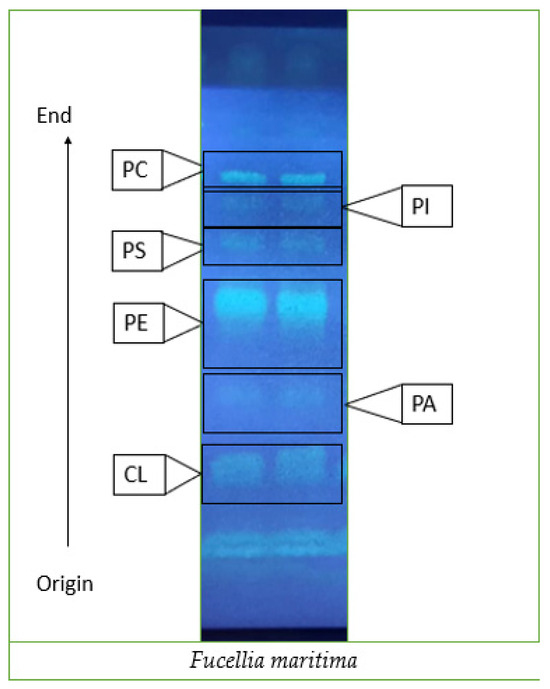 Supplementation with PEs in the diets of zebrafish, Danio rerio, can increase egg diameter and larval survival rate, making this phospholipid important for aquafeed formulation [29]. Moreover, the addition of PEs to the diet of the large yellow croaker (Larimichthys crocea) was shown to alleviate damage in intestinal cells when using a diet rich in SFAs [30]. The second most abundant PL in F. maritima, PC, is recognized for its role in lipid metabolism, liver function, and transport of lipids in the body. Supplementing a diet low in fish meal with PC can significantly increase lipid digestibility, subsequently eliminating excessive gut mucosal lipid accumulation in Atlantic salmon (Salmo salar L.) [31]. The presence of PC and PEs in high levels suggests that F. maritima meal may have beneficial properties related to lipid metabolism if included in aquafeeds.