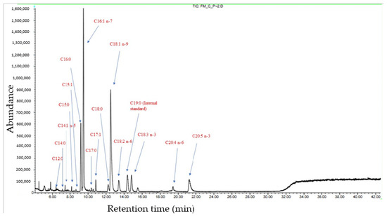 The GC-MS analysis showed that the most abundant FA was palmitoleic acid (C16:1 n-7), followed by oleic acid (C18:1 n-9). Regarding the amount of LC-PUFAs, such as eicosapentaenoic acid (C20:5 n-3) or arachidonic acid (C20:4 n-6), these were present in a considerably lower amount. The n-6/n-3 ratio was 0.5 ± 0.1 (Table 2). A chromatogram with identified peaks can be visualized in Figure 2.