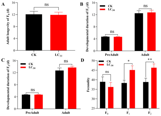 Developmental duration (A–C) and fecundity (D) of F0–F2 generations of A. gossypii treated with LC30 of lambda-cyhalothrin. Means ± SE in the same row followed by the same lowercase letters represent significant differences between treatments using a paired bootstrap test (ns denotes insignificance, * denotes p-value less than 0.05, and ** denotes p-value less than 0.01).