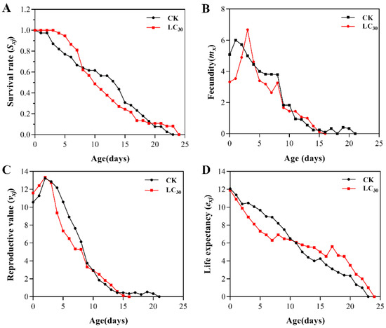 Age-stage specific survival rate (Sxj) (A), age-specific fecundity (mx) (B), age-stage reproductive value (vxj) (C), and age-stage specific life expectancy (exj) (D) of F0 generation of A. gossypii treated with LC30 of lambda-cyhalothrin.
