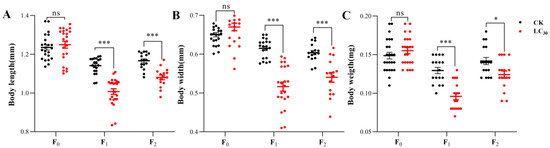 The body length, width, and weight of the F2 generation of A. gossypii in the LC30 lambda-cyhalothrin treatment were significantly reduced compared to those of the control (Figure 3).