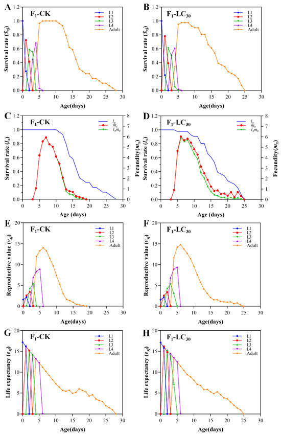 Age-stage specific survival rate (Sxj) (A,B), age-specific survival rate (lx), age-specific fecundity (mx), age-specific maternity (lxmx) (C,D), age-stage reproductive value (vxj) (E,F), and age-stage specific life expectancy (exj) (G,H) of F1 generation of A. gossypii treated with LC30 of lambda-cyhalothrin.